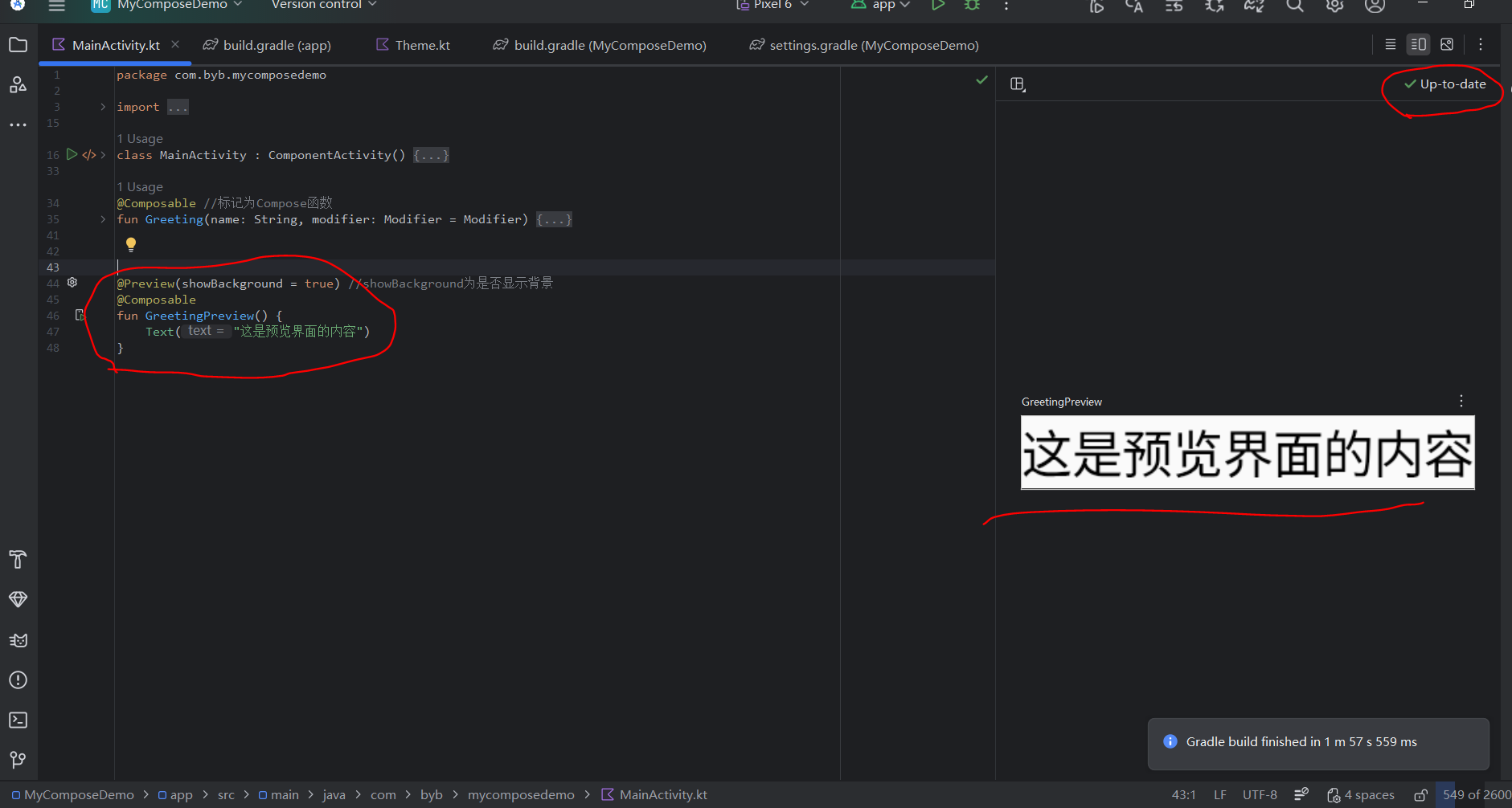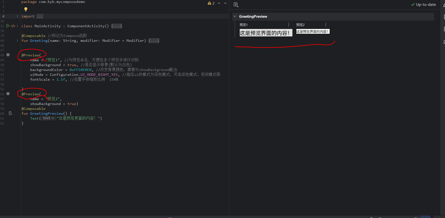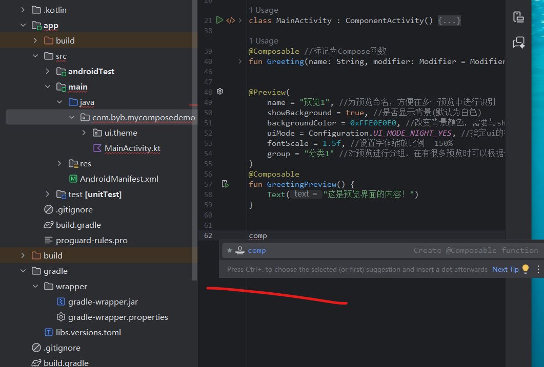 注:软件自动生成Compose的activiy页面后的自带示例代码,具体每行代码作用介绍如下