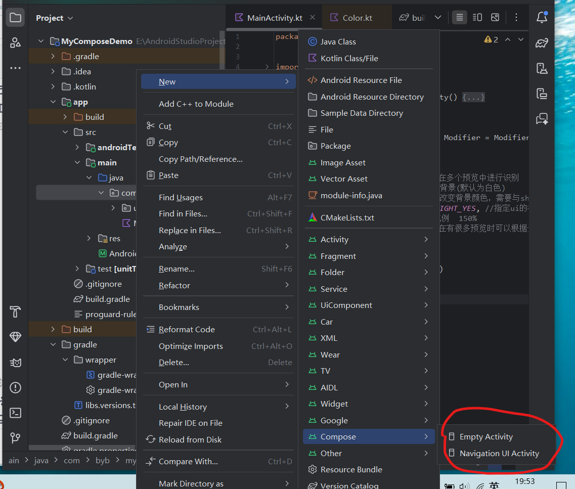 使用Android studio自带的方式快捷创建带有Compose的activity,可选择空白或者带有导航的activity(右键当前文件\new\Compose)