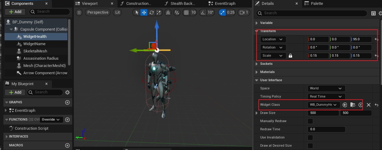 在BP_Dummy内添加Widget组件,并指定WB_DummyHealth;