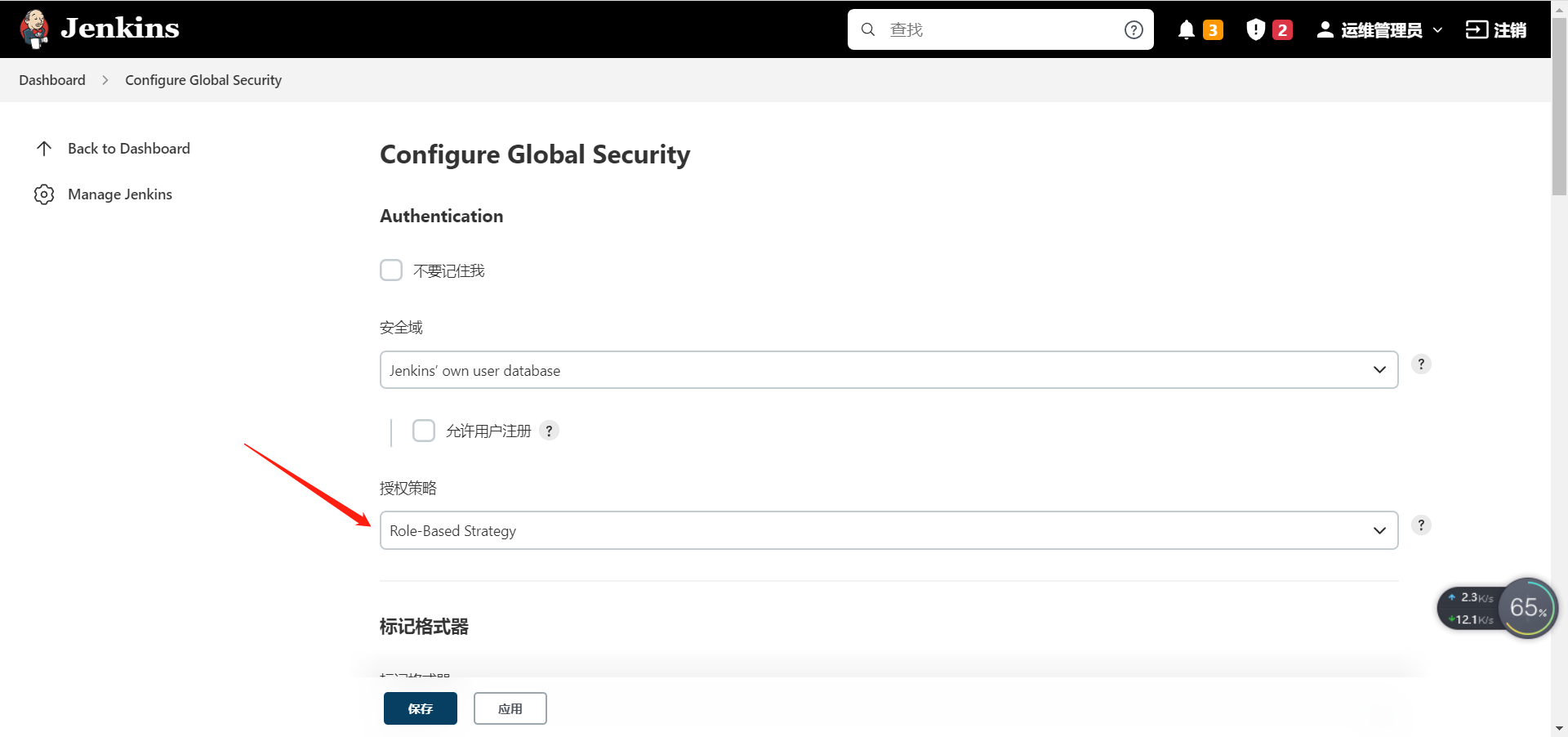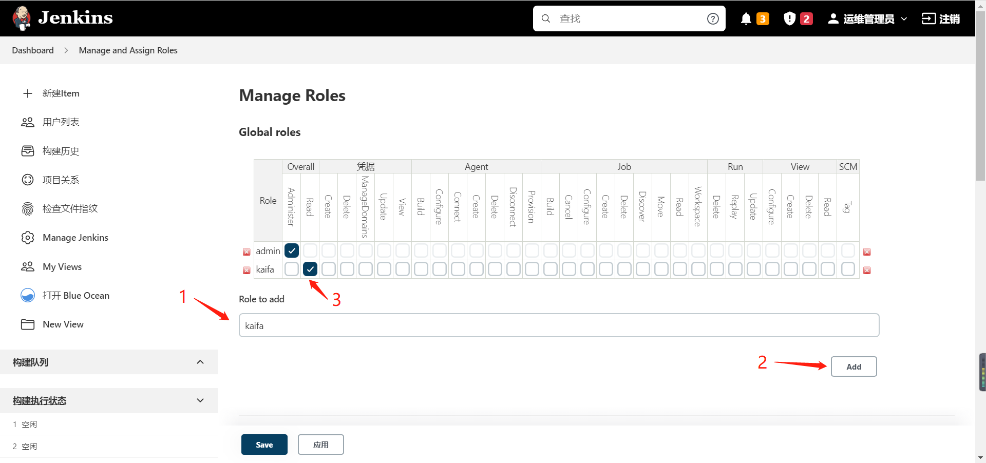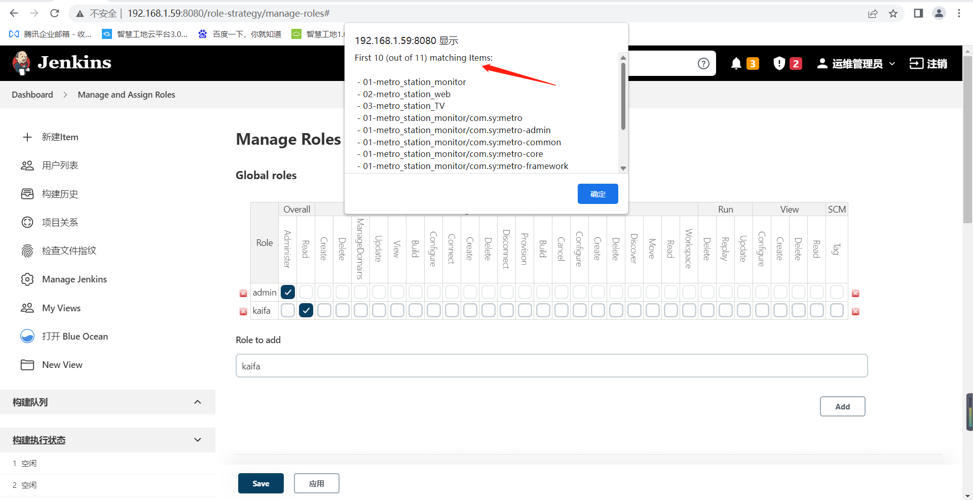 3、在管理角色里新增一个全局角色kaifa,只授权Overall的read权限,注意全局角色不要授权job,不然用户只能看指定的项目的权限不生效