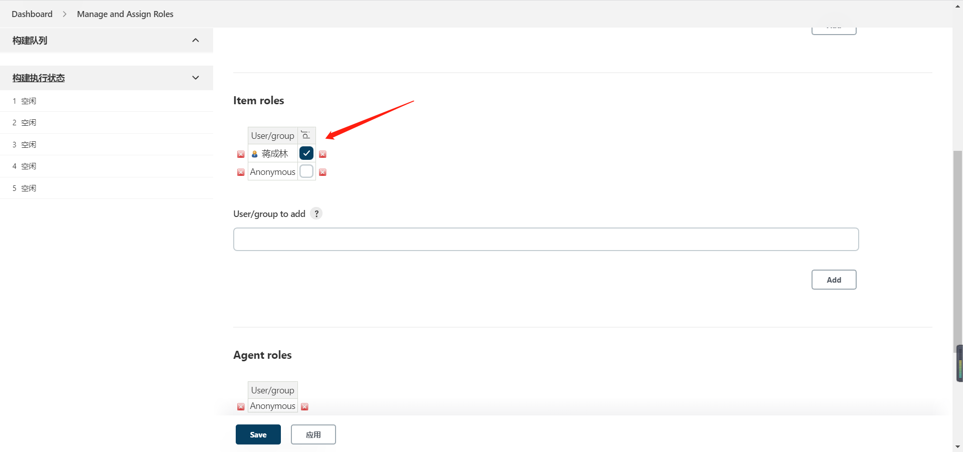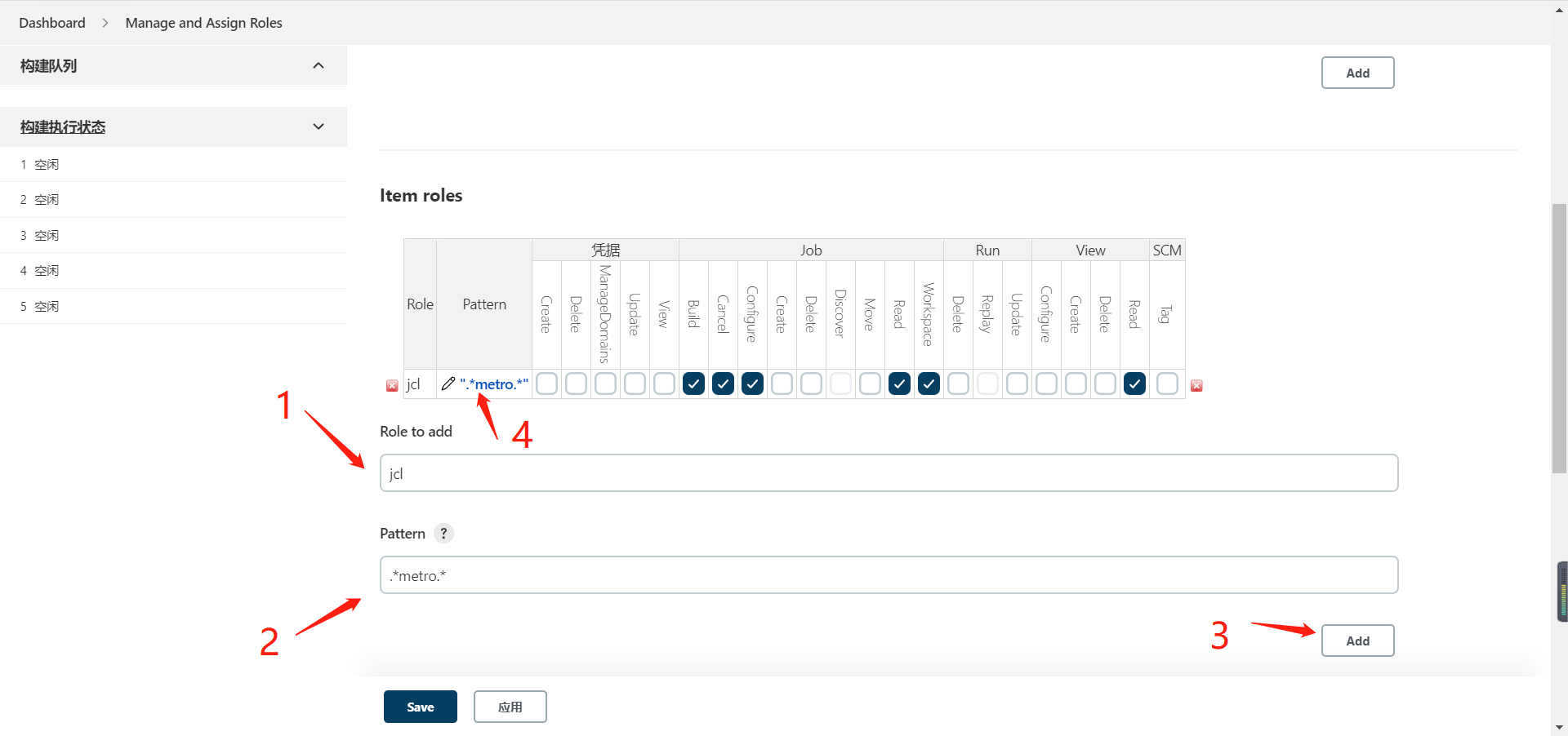 4、在管理角色里下拉找到项目角色 Item role,新建jcl角色,pattern里写正则表达式匹配项目名字。然后点击蓝色字体.*metro.*查看符合正则表达式的项目名字。