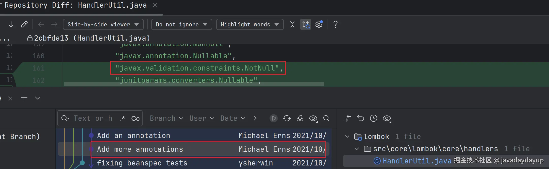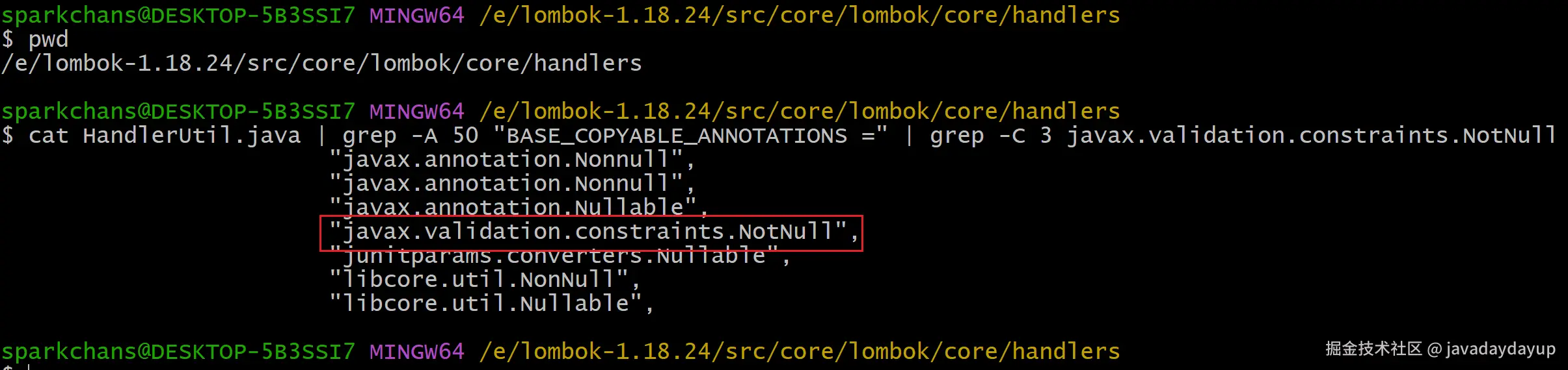 在 lombok 的 HandlerUtil 里面定义了 BASE_COPYABLE_ANNOTATIONS 的一个名单,在这个名单里面的注解在生成 getter() 或者 setter() 会进行拷贝,在 lombok 的 1.18.24 版本是配置了 javax.validation.constraints.NotNull 的。如下图所示: