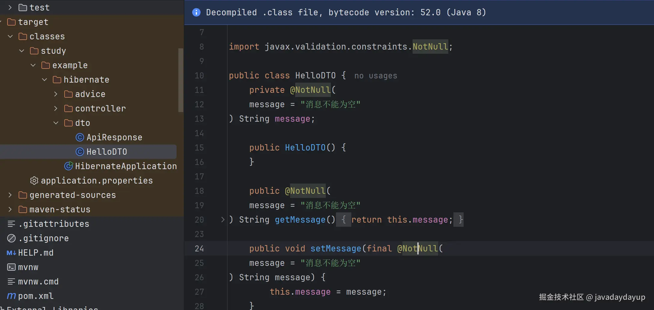 首先定义了一个 TestDTO,它的类上使用了 @Data 注解修饰,它的字段上使用 @NotNull 注解修饰。代码如下: