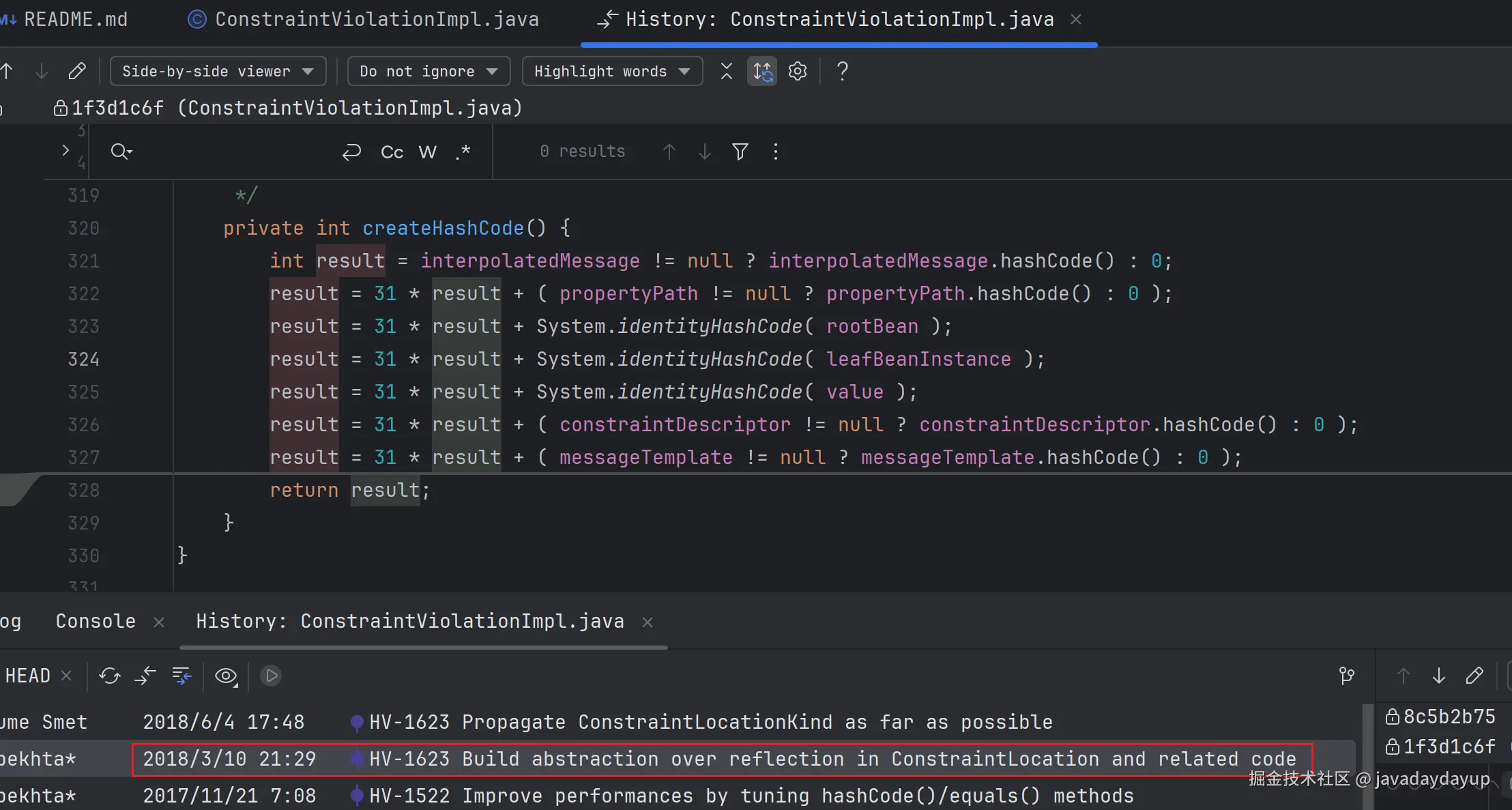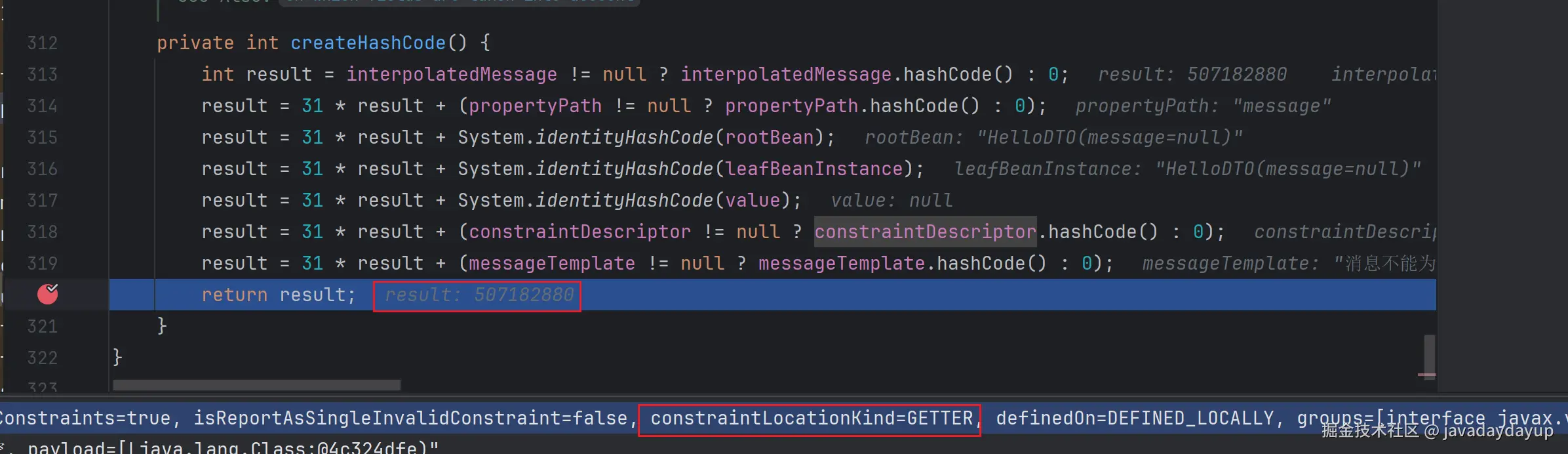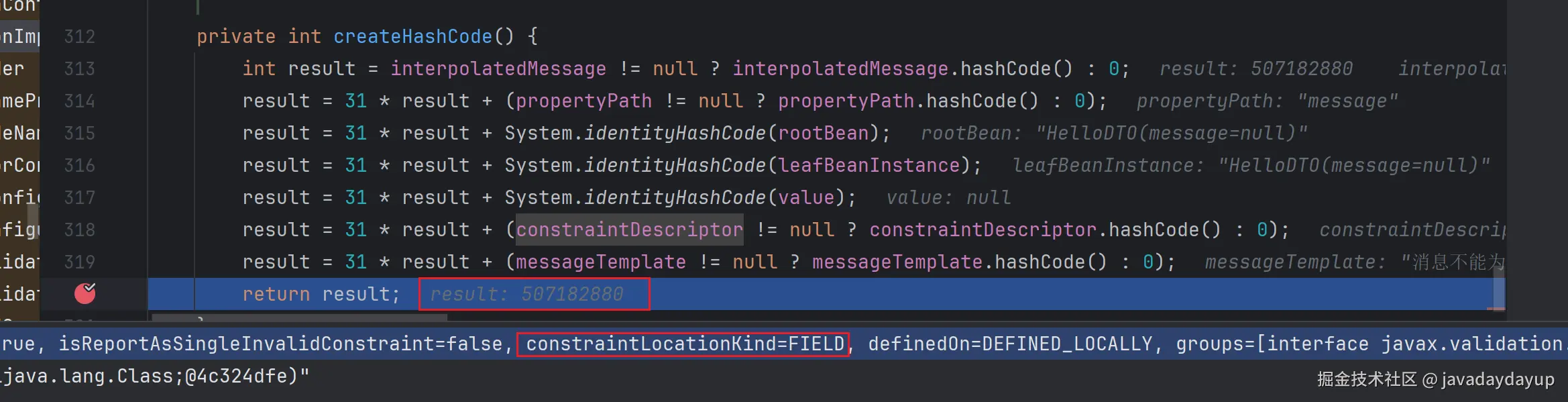 但是在 6.2.0.Final 版本里,ConstraintViolationImpl 的 createHashCode() 方法把 elementType 给移除了,那么字段和 getter() 方法创建对象计算出来的 hashCode 是不一样的,从而达到了去重的目的。如下图所示: