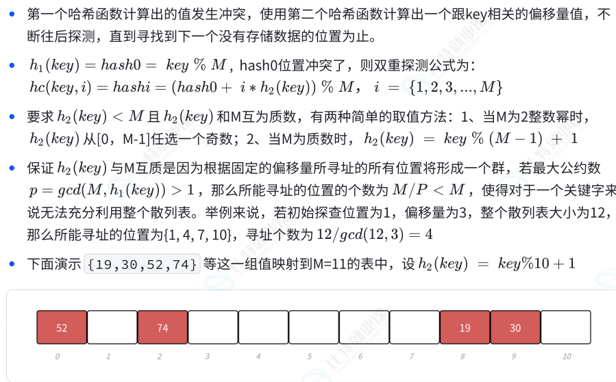这⾥我们哈希表负载因子控制在0.7,当负载因子到0.7以后我们就需要扩容了,我们还是按照2倍扩容,但是同时我们要保持哈希表大小是⼀个质数,第⼀个是质数,2倍后就不是质数了。那么如何解决了,⼀种方案就是上⾯1.4.1除法散列中我们讲的Java HashMap的使⽤2的整数幂,但是计算时不能直接取模的改进⽅法。另外⼀种⽅案是sgi版本的哈希表使⽤的⽅法,给了⼀个近似2倍的质数表,每次去质数表获取扩容后的大小。