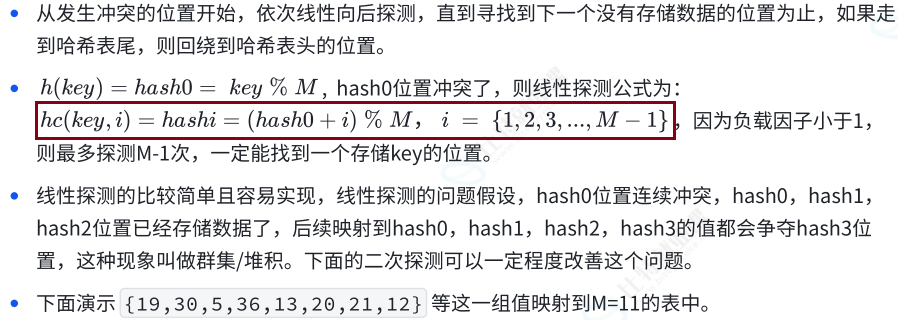 在开放定址法中所有的元素都放到哈希表⾥,当⼀个关键字key⽤哈希函数计算出的位置冲突了,则按照某种规则找到⼀个没有存储数据的位置进⾏存储,开放定址法中负载因⼦⼀定是小于的。这⾥的规则有三种:线性探测、⼆次探测、双重探测。