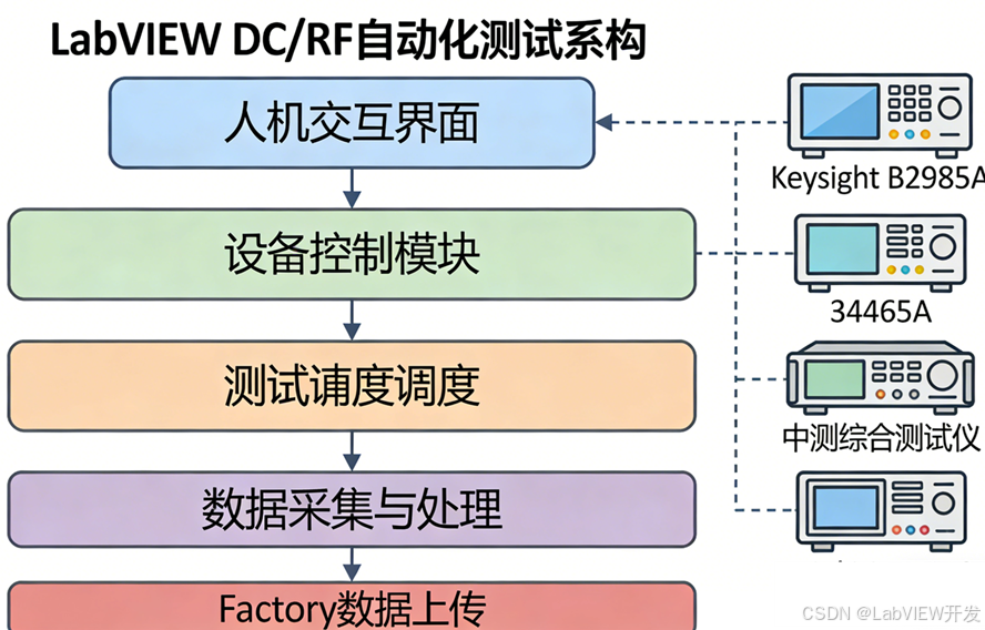 LabVIEW开发,聚焦DC/RF 类被测件的自动化测试,以模块化架构、多仪器协同、全链路数据闭环为核心,充分发挥 LabVIEW 在测控领域的原生优势,兼顾专业性与灵活扩展性。