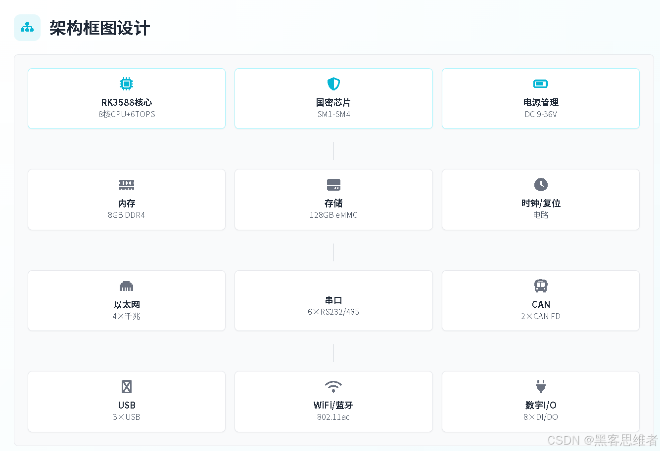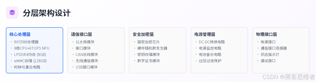 模块化设计原则:硬件架构采用分层模块化设计,包括核心处理层、通信接口层、安全加密层、电源管理层等,各模块间通过标准接口连接,便于维护和升级。处理器采用 RK3588 工业级 NPU 芯片,支持 6TOPS 算力,满足边缘 AI 应用需求。