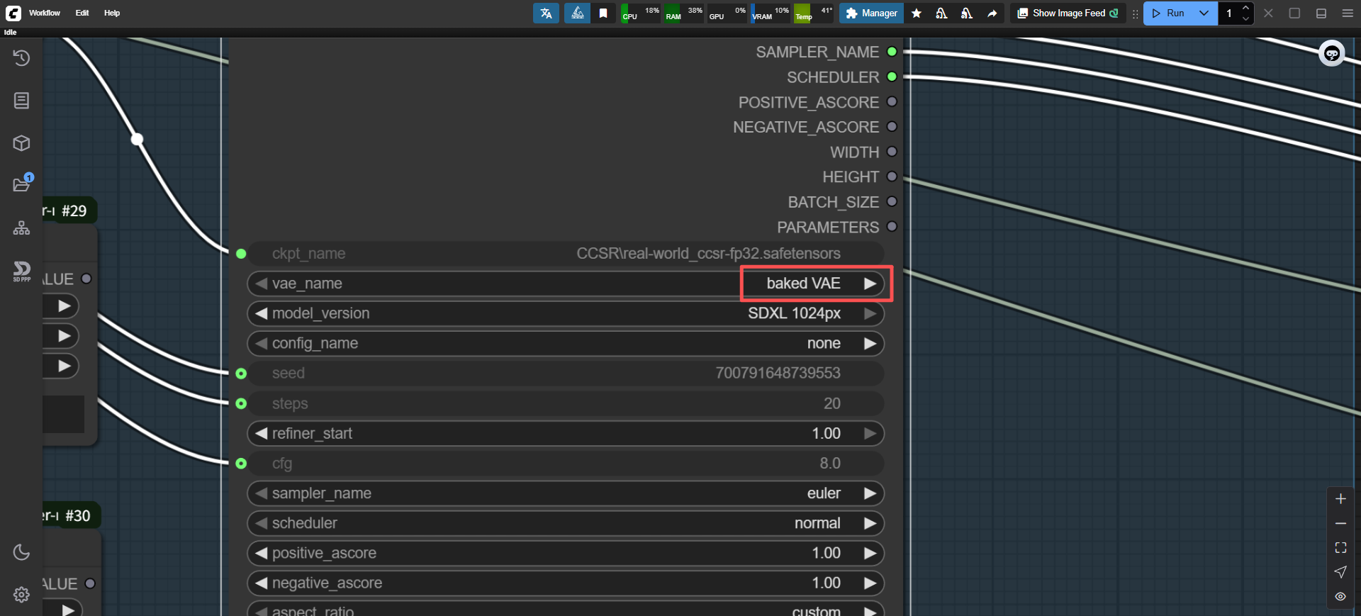 里面最重要的就是vae_name,有一个baked vae就是大模型的vae,因为等下保存信息的节点没有这个选项,就一定得选别的vae.....