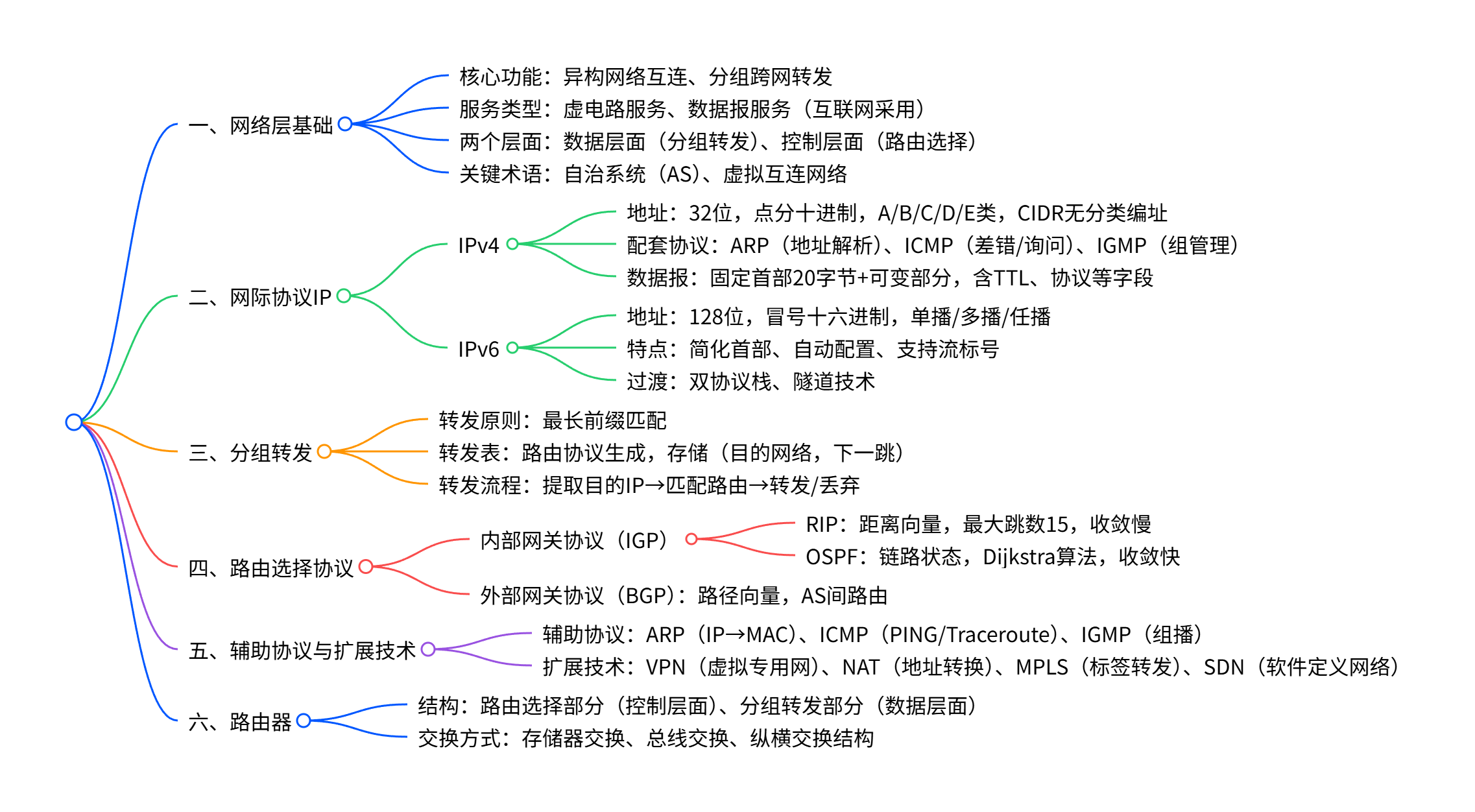 网络层是计算机网络体系结构的核心层,核心职责是实现异构网络互连 与分组跨网可靠转发,通过 IP 协议定义全局唯一地址标识网络节点,依托路由选择协议构建转发路径,搭配 ARP、ICMP 等辅助协议解决地址解析与差错处理,同时支持 VPN、NAT、MPLS、SDN 等扩展技术,为上层提供无连接的尽最大努力交付服务,是实现全网通信的关键支撑。