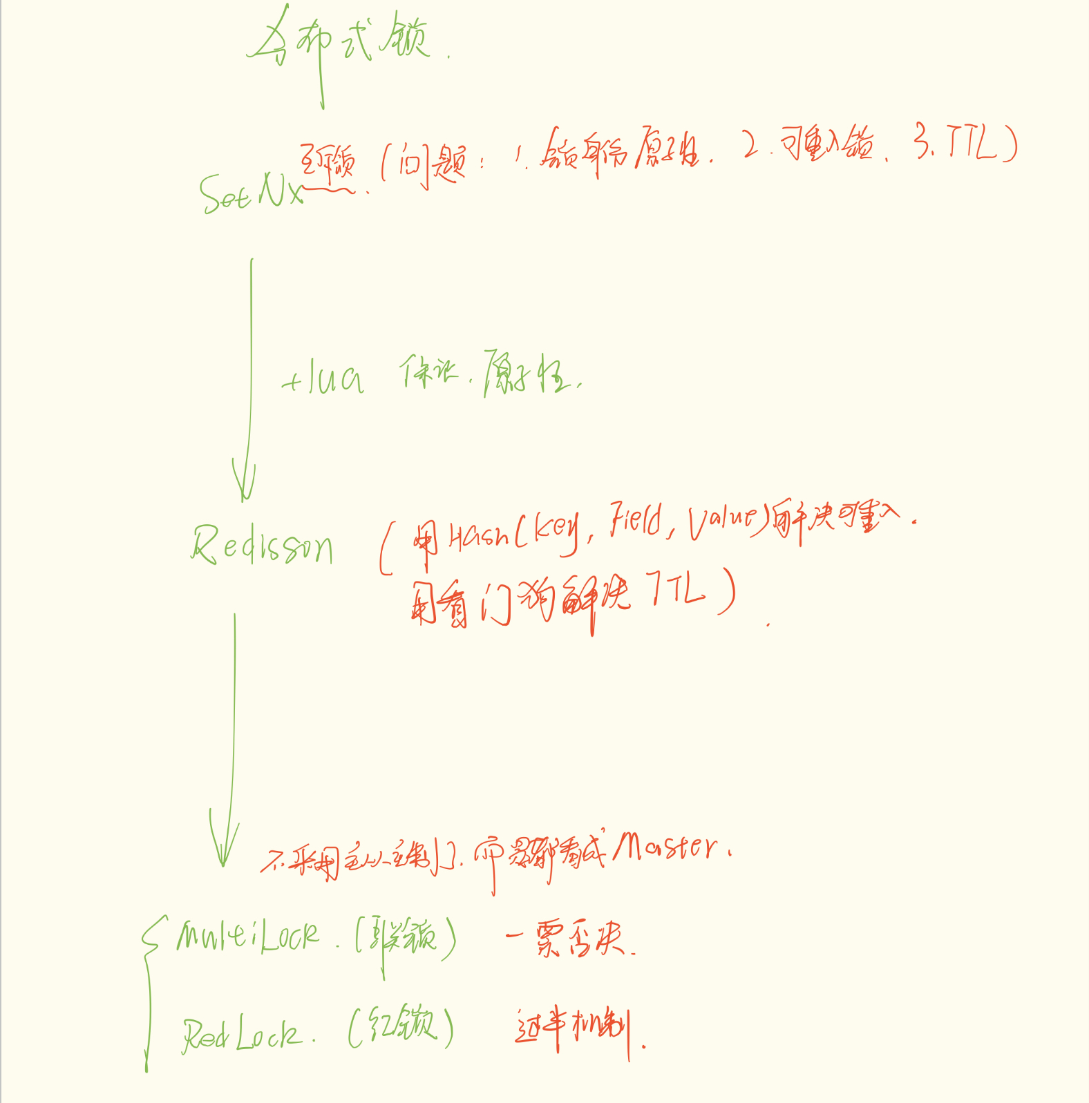 它主要不是为了解决主从切换问题的,而是为了**"同时锁定多个互不相关的资源"**(比如我要同时锁定"订单表"和"库存表",这俩必须一起锁住才有意义)。但在解决主从问题上,它因为要求 100% 存活,一旦有一个 Redis 节点坏了,整个系统就没法加锁了,可用性太差。