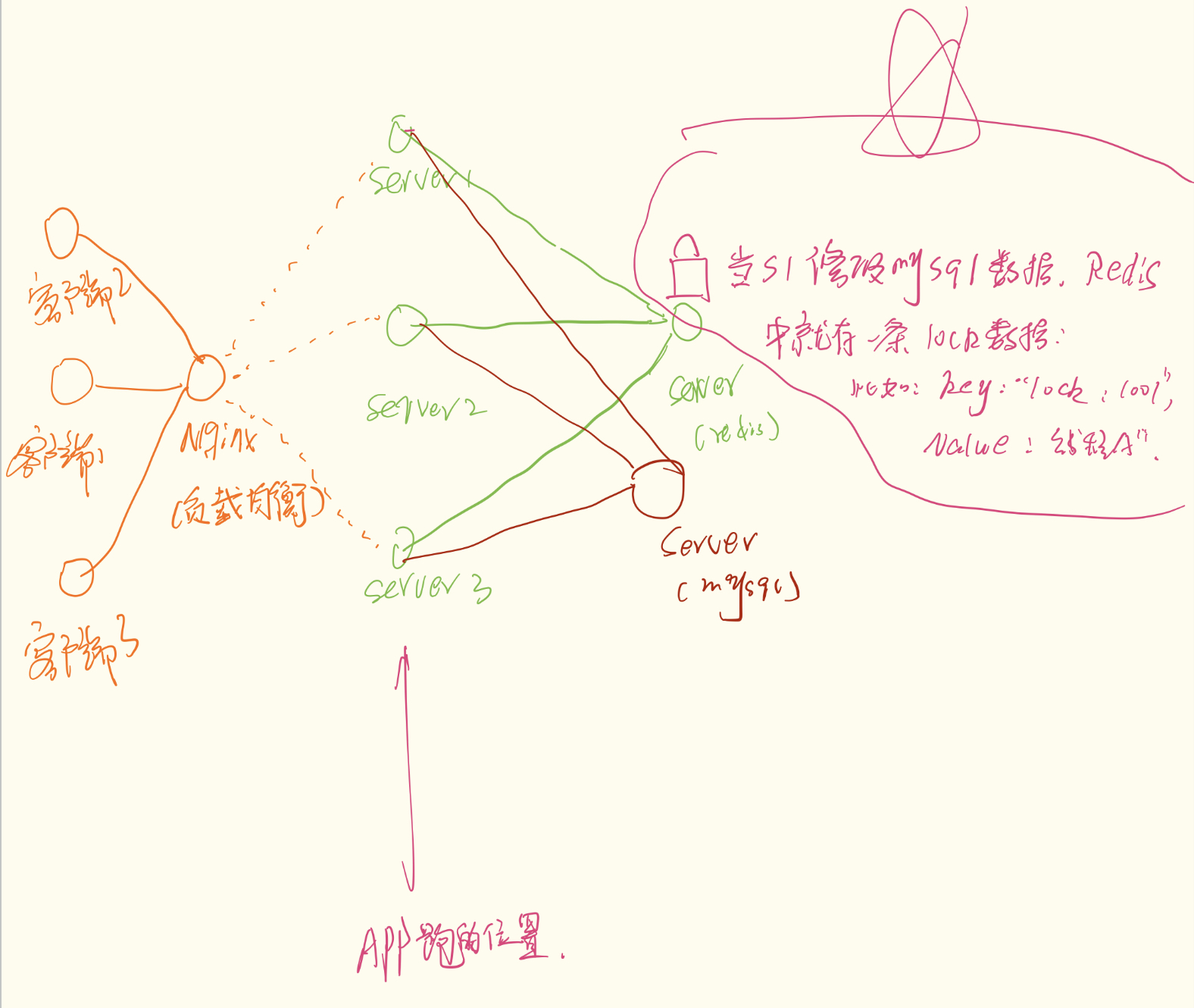 这就好比三个办事员(App Server A, B, C)都要去唯一的档案柜(MySQL)修改同一份文件。为了防止冲突,他们在旁边的墙上挂了一个唯一的"令牌"(Redis Key)。