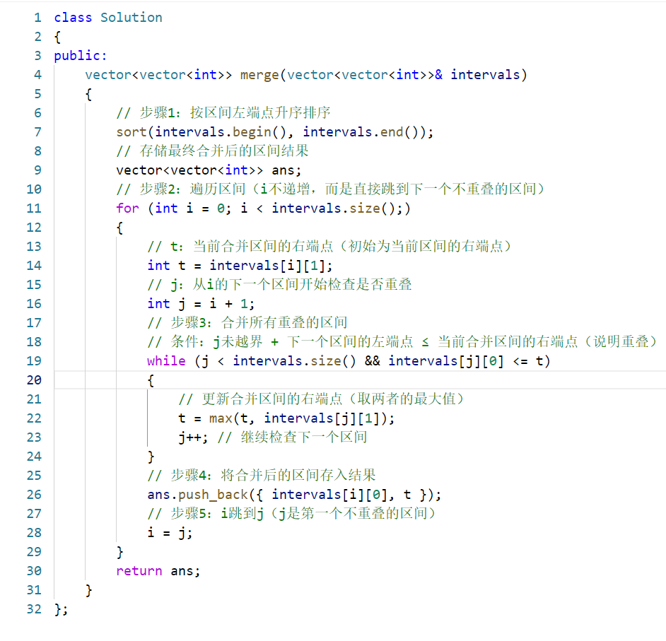 t = max(t, intervals[j][1]):必须取最大值,避免出现「当前区间包含后续区间」的情况。例如:当前合并区间是[1,5],下一个区间是[2,4]→ 合并后右端点仍为5(而非4)。 -