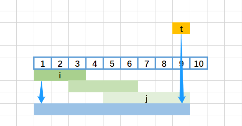 intervals[j][0] <= t:下一个区间的左端点 ≤ 当前合并区间的右端点 → 两个区间重叠 / 相邻,需要合并。例如:当前合并区间是[1,3],下一个区间是[2,6]→2 ≤ 3,合并为[1,6];若下一个区间是[4,5]→4 > 3,不重叠,停止合并。 -