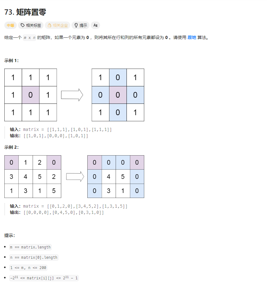 matrix[i][0])或列标记(matrix[0][j])为 0,当前位置就置 0。