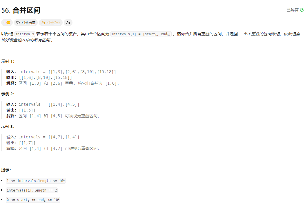 - 遍历合并:逐个检查区间,将当前区间与后续所有重叠的区间合并为一个大区间,直到遇到不重叠的区间为止,再将合并后的区间存入结果。