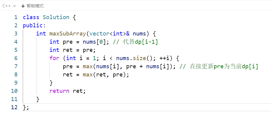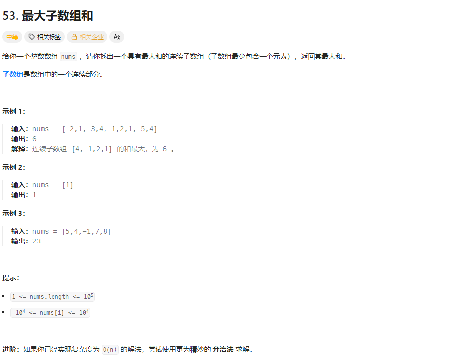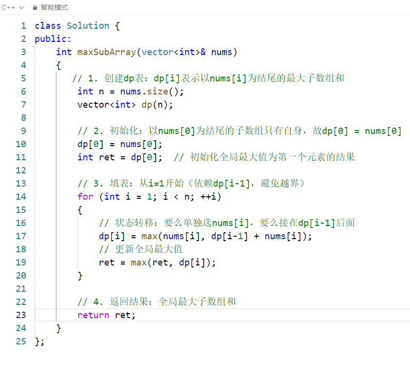 该解法的核心是动态规划 ,通过定义状态 dp[i] 表示「以 nums[i] 为结尾的最大子数组和」,将原问题拆解为更小的子问题,逐步推导最优解。