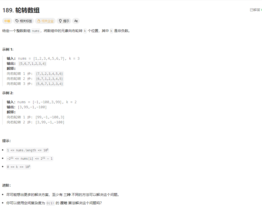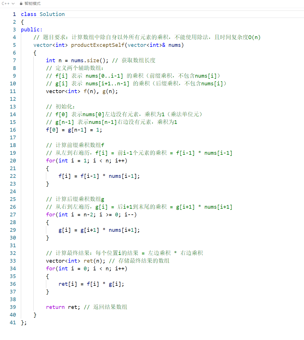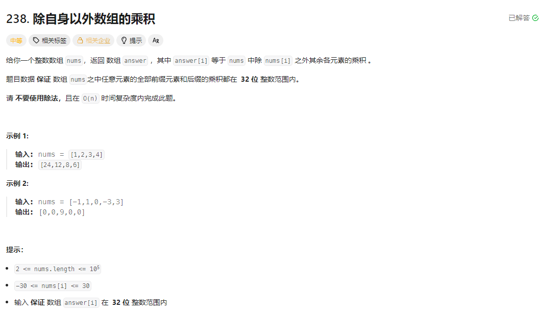 - 时间复杂度:O (n),仅遍历数组一次,每个元素的计算是 O (1)。