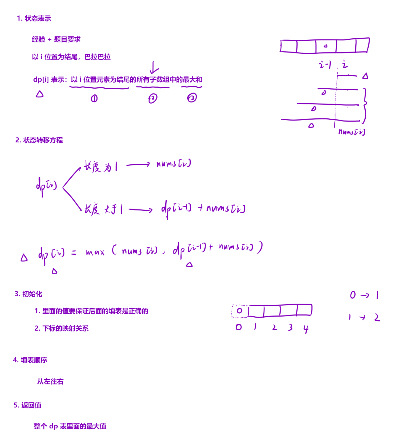 // 1. 创建dp表:dp[i]表示以nums[i]为结尾的最大子数组和
