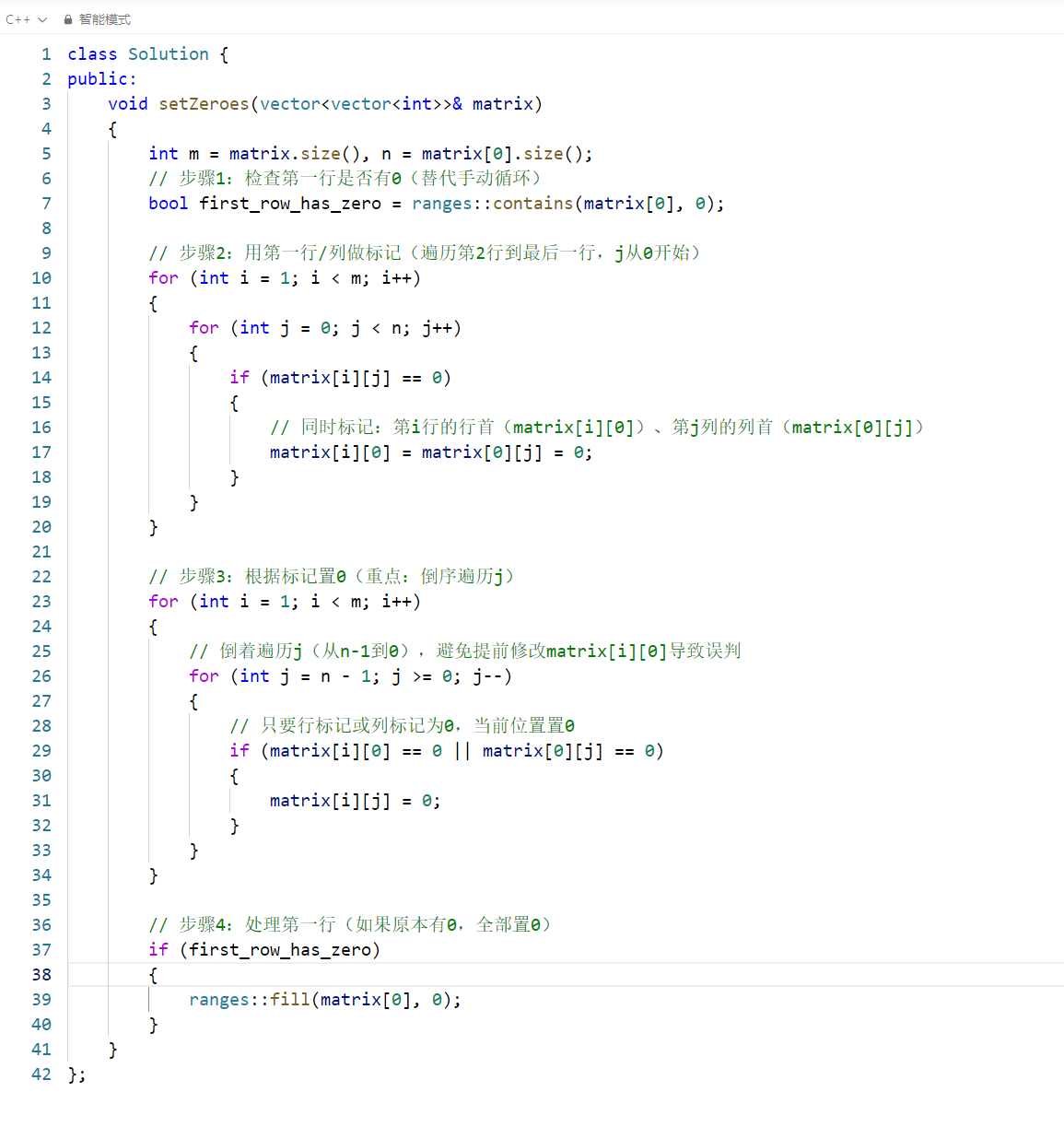 m:矩阵行数,n:矩阵列数;first_row_has_zero:提前记录第一行是否有 0。关键原因:后续会用第一行作为列的标记位,直接修改第一行的值,因此必须先保存原始状态,否则会丢失第一行是否该置 0 的信息;ranges::contains:C++20 的范围库函数,等价于遍历matrix[0]判断是否有 0,简化代码。
