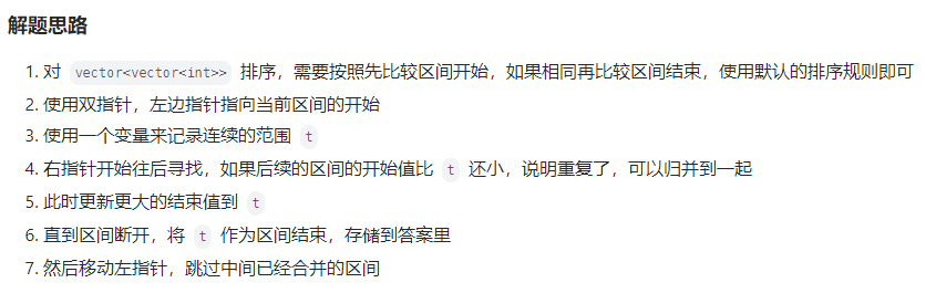 sort(intervals.begin(), intervals.end())对二维向量排序时,默认按第一个元素升序 ,第一个元素相等则按第二个元素升序。例如:输入[[1,3],[2,6],[8,10],[15,18]]排序后仍为原顺序;输入[[2,3],[1,4]]排序后变为[[1,4],[2,3]]。 -