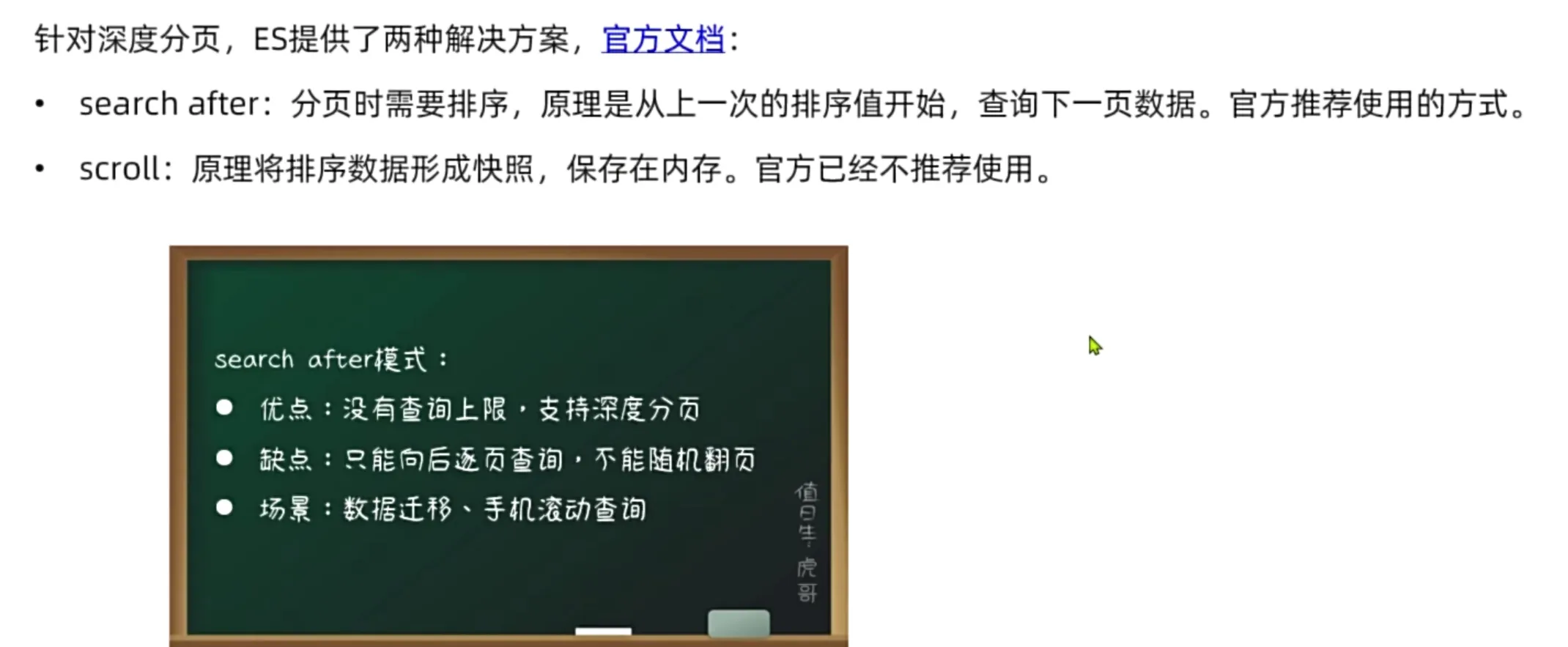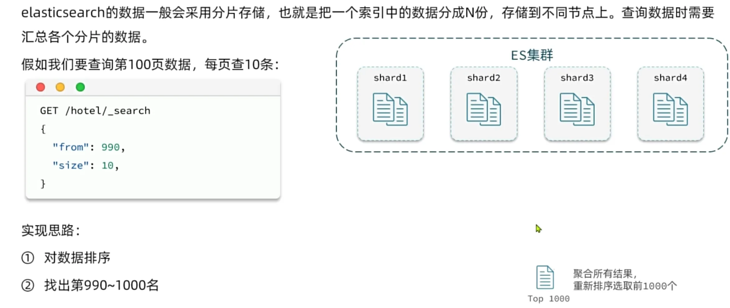 假如我们要查第100页数据,每页查十条,也就是查第990到1000这十条数据。但并不是简单的查到这1000条数据然后返回最后十条,而是把每个分片前1000条数据都拿出来合并到一起排序,选出前1000条然后返回最后十条。当要查询第一万页数据时,数据量极大,可能会导致内存炸裂。