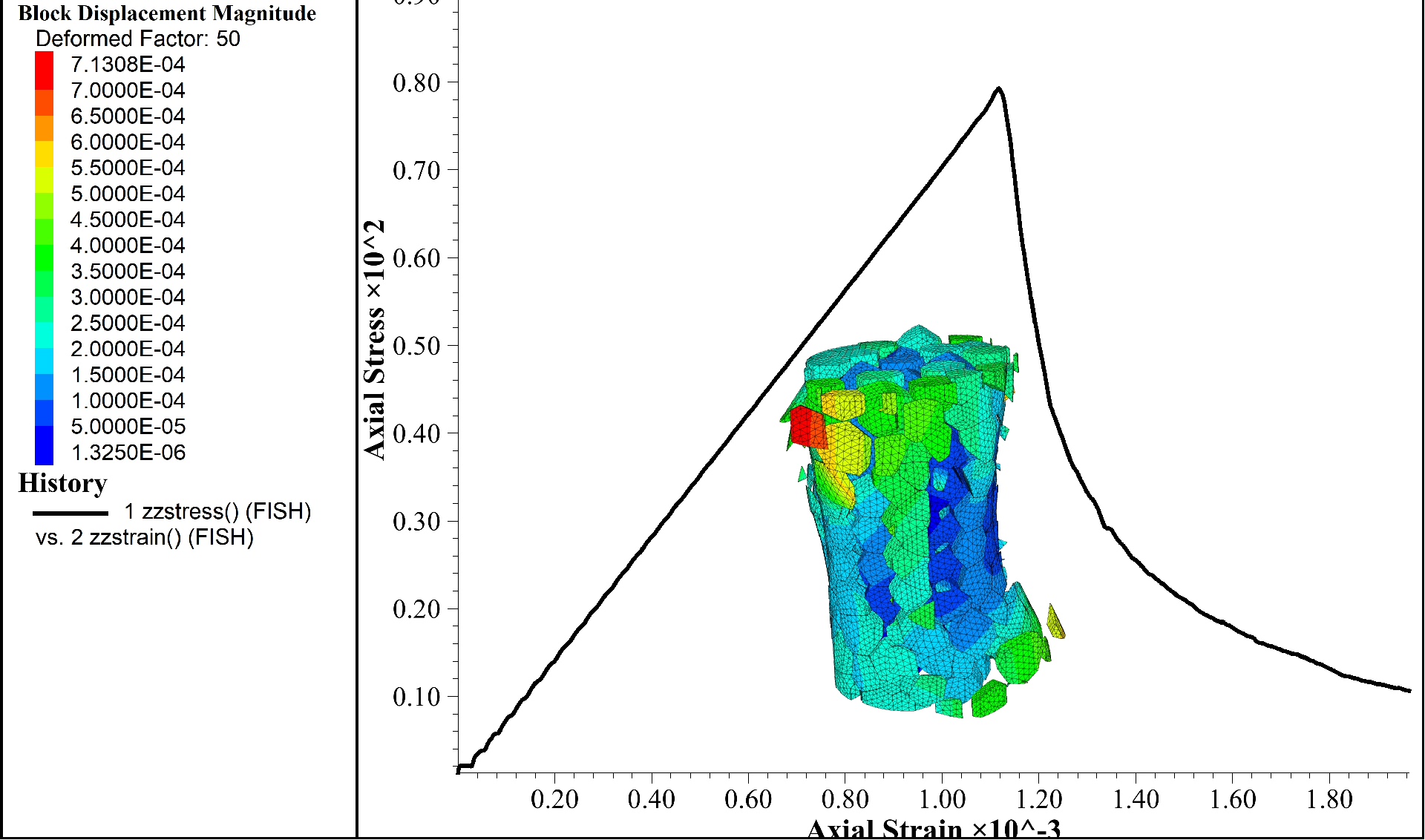 在三轴试验计算结果中,我们会发现相比单轴压缩,由于围压的存在,块体的承载能力有所提高。应力应变曲线的弹性阶段可能更长,塑性阶段的变形特征也与单轴情况不同。例如,在相同的轴向压力下,三轴试验中的块体应变增长更缓慢,这体现了围压对材料变形和破坏的约束作用,能帮助我们更深入了解材料在复杂应力状态下的力学性能。