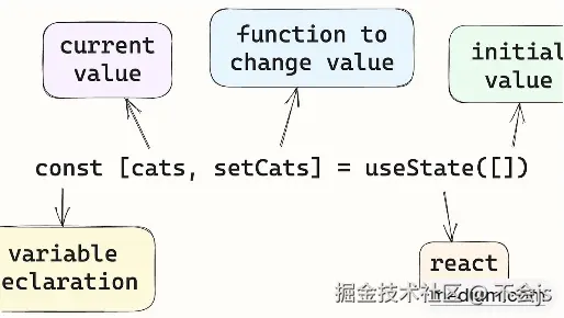 useState 返回 [状态值, 更新函数]。调用更新函数会触发重渲染,React 记住最新状态。