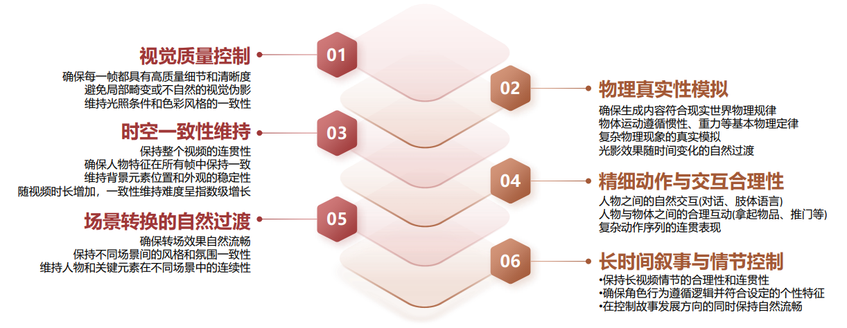AI视频生成需攻克多维度技术难题,才能实现从"可用"到"好用"的跨越,核心挑战集中在以下6个方面: