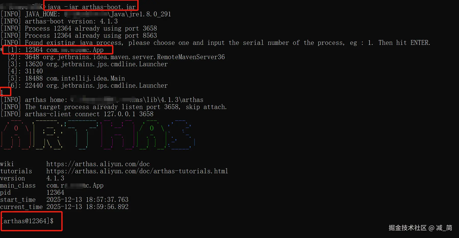 java -jar arthas-boot.jar-》列出当前机器上所有 Java 进程 - 输入目标进程的编号,进入 Arthas 命令行(提示符如