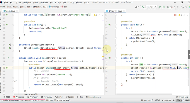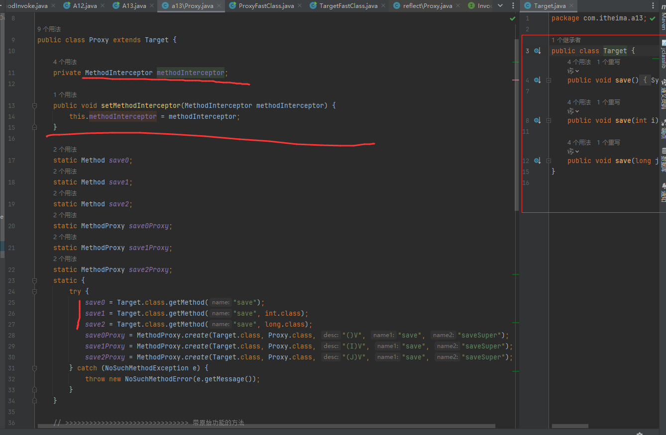 一个就是两个代理类,避免反射 -代理类中的invoke是调用了原始方法-继承写的