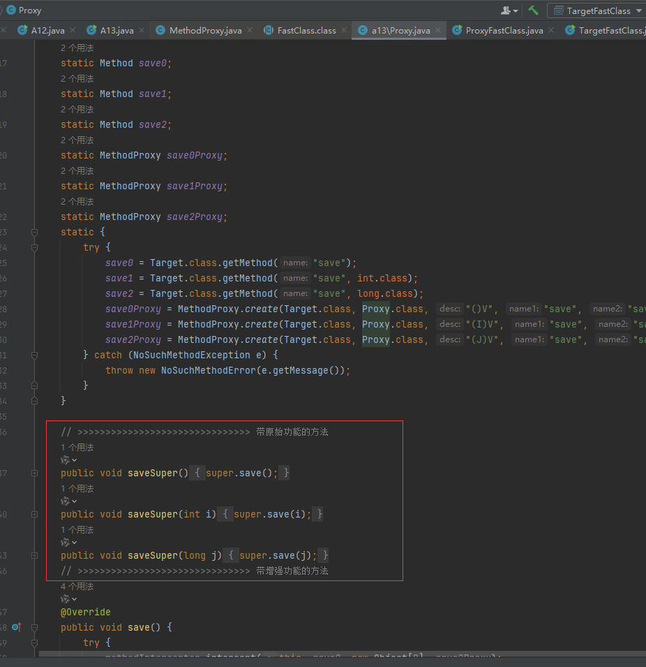 CGLIB 代理类直接发起 super.save() 的字节码调用 |