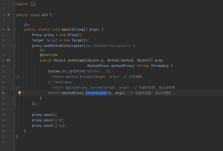 // 方式 2:使用 methodProxy.invokeSuper() 调用父类方法(CGLIB 方式,性能更好)