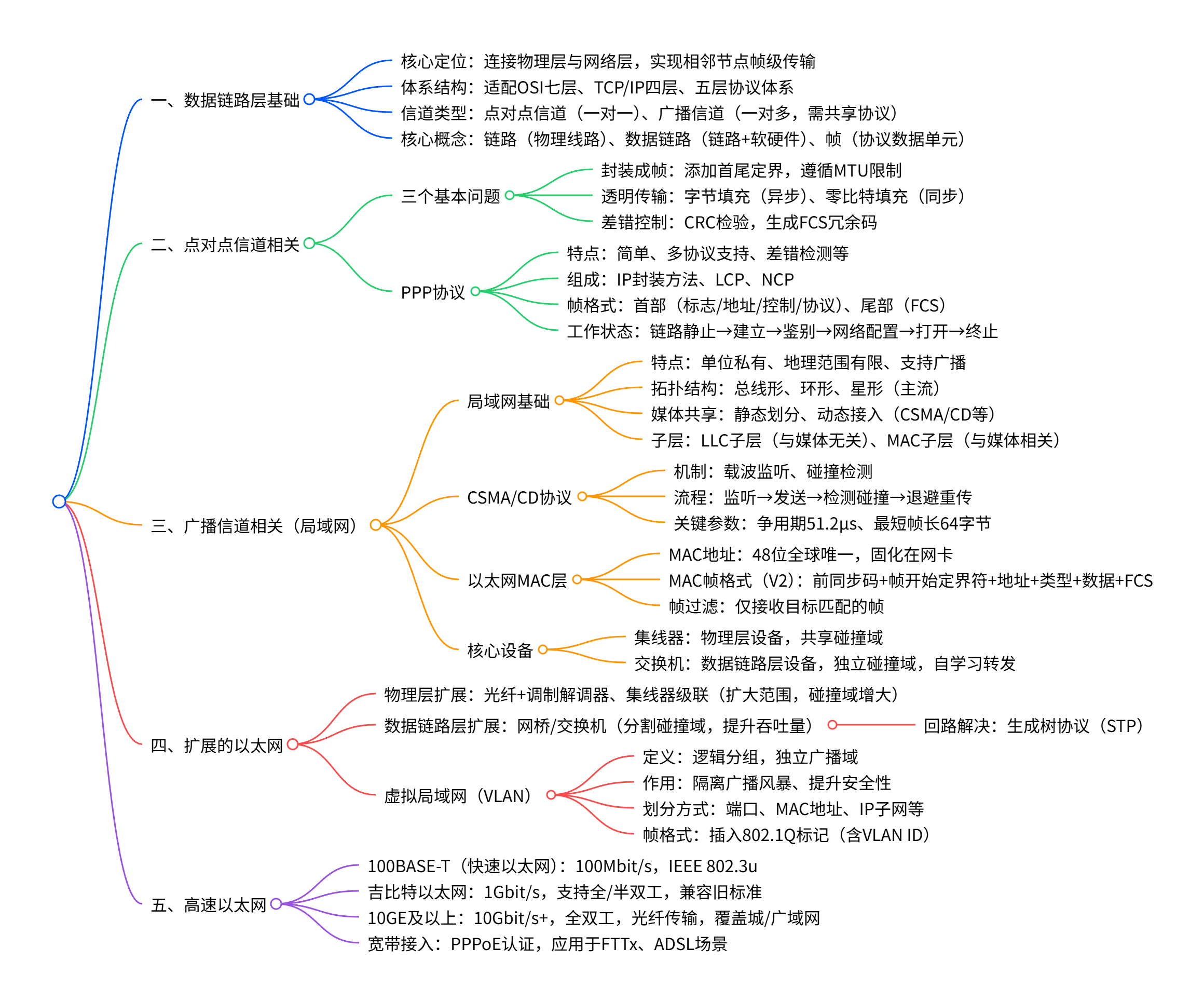 数据链路层的核心是 "帧传输与控制",针对不同信道(点对点 / 广播)设计差异化协议(PPP/CSMA/CD),通过封装成帧、透明传输、差错控制三大机制保障数据可靠传输。以太网作为主流技术,从传统共享式发展到交换式、高速化、虚拟化(VLAN),已覆盖局域网、城域网甚至广域网场景,是计算机网络中最基础且应用最广泛的链路层技术。