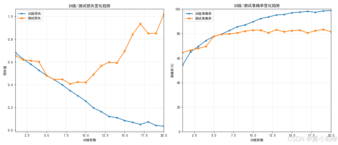测试集表现:前 10 轮测试损失下降、准确率上升(模型正常学习);10 轮后测试损失骤升、准确率波动下降(模型开始学习训练集的噪声和冗余特征,对新数据的适配能力下降)。