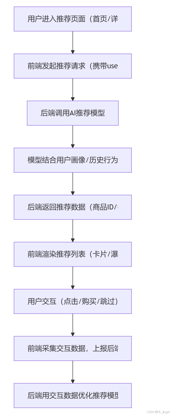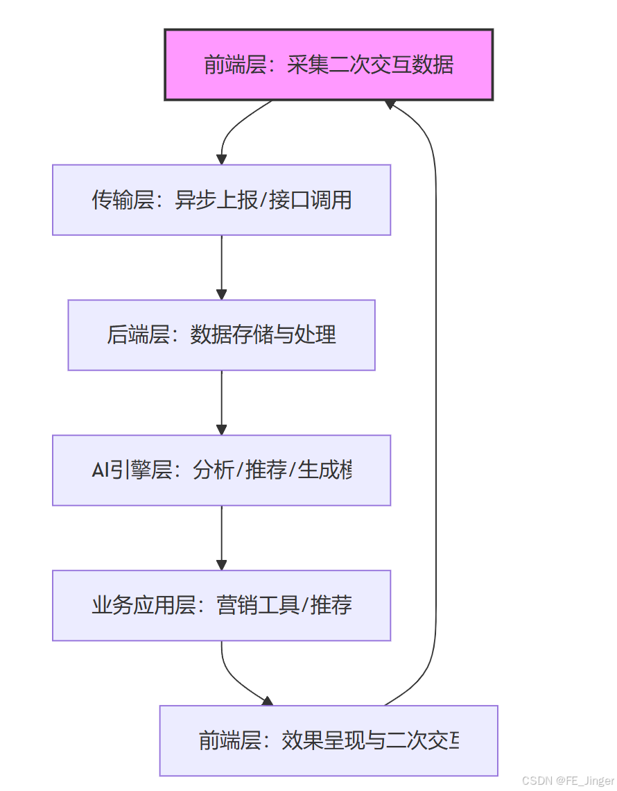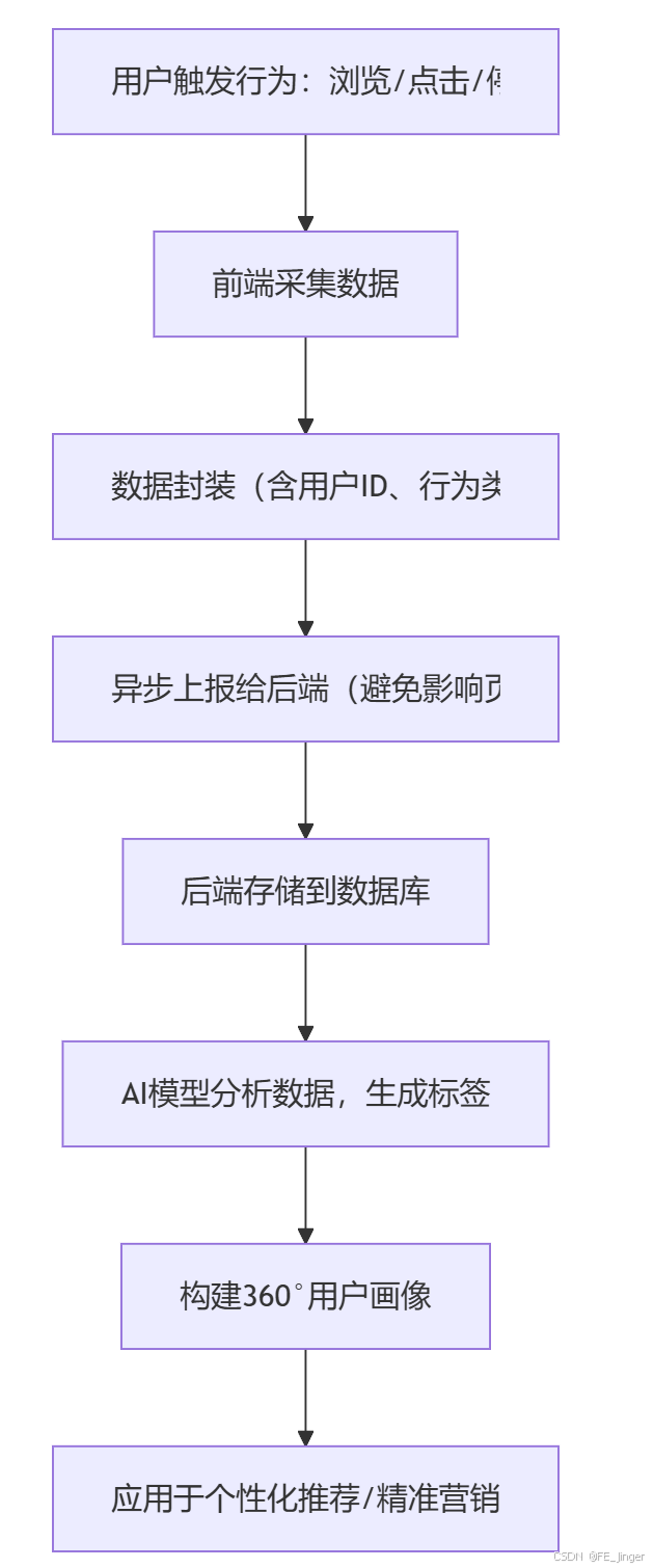 前端采集用户行为数据 → 传给后端存储 → AI模型分析数据(比如识别用户兴趣、购买意向) → 生成用户标签和画像 → 提供给其他营销系统使用。