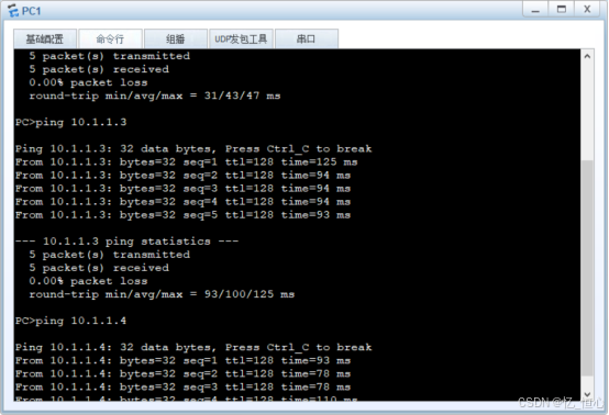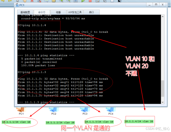 测试PC1与其他PC是否可以连通,我们发现,即使与PC3是同一个vlan,也不能连通,更不用说与其他不同vlan的PC。