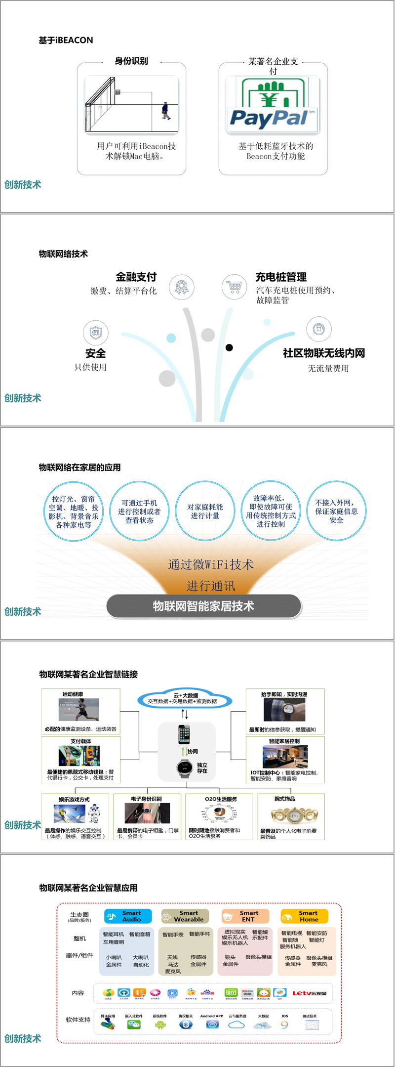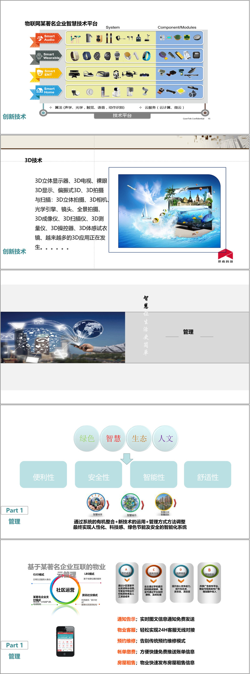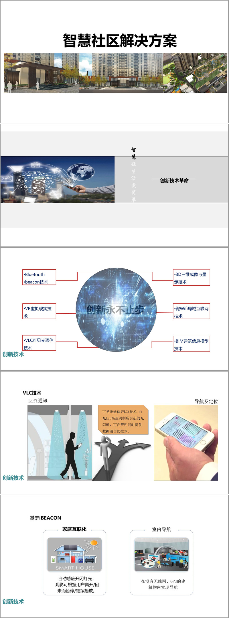 技术层面,方案整合多元创新技术搭建智慧底座。蓝牙与 Beacon 技术实现室内精准导航,支持家庭设备自动感应控制与安全身份识别,还可应用于支付场景;VLC 可见光通信技术借助白光 LED,在照明同时完成数据传输;3D 技术拓展至显示、拍摄、扫描等领域,如 3D 体感试衣镜提升生活体验;BIM 建筑信息模型与微 WiFi 技术协同,前者优化社区规划建设,后者保障家居设备无线通讯与信息安全。物联网技术是核心纽带,构建社区专属无线内网,支撑安全支付、充电桩管理,在智能家居中实现耗能计量、远程控制与故障应急处理,还通过智能手表等可穿戴设备打造 "健康监测 - 信息交互 - 支付控制 - 身份识别" 一体化链接,形成覆盖影音、安防、照明等领域的智慧生态圈。