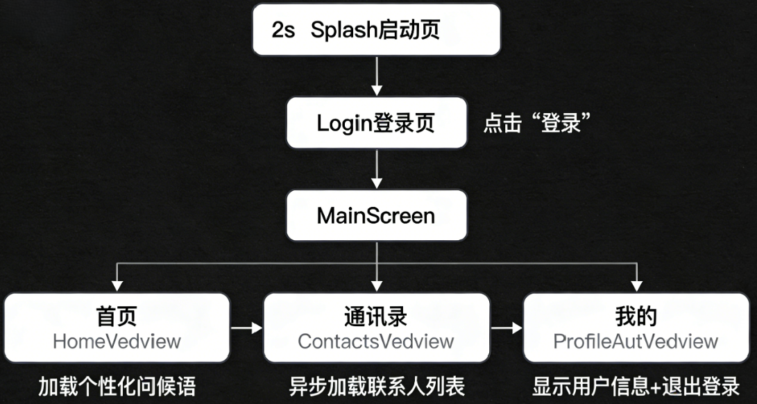 - 主页(带底部导航:首页 / 通讯录 / 我的)