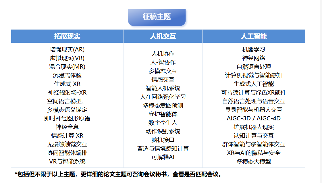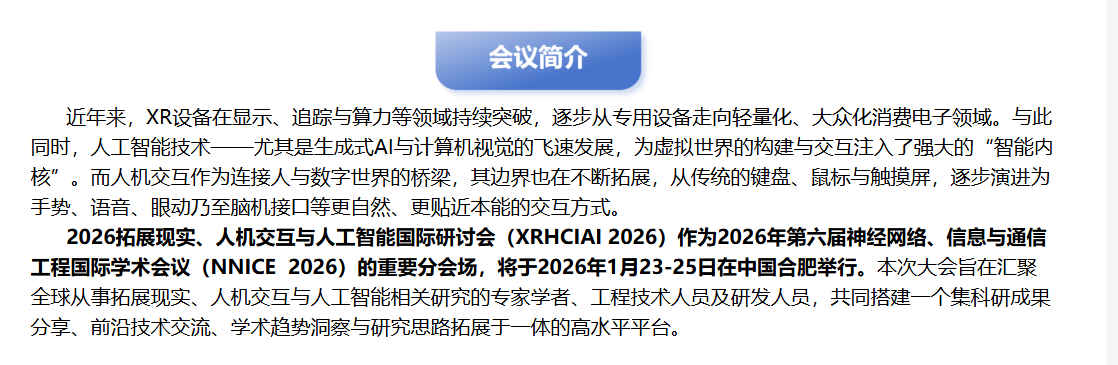 拓展现实(XR)、人机交互(HCI)与人工智能(AI)的融合是下一代智能交互技术的核心方向,也是 XRHCIAI 2026 研讨会聚焦的核心领域。三者的协同不仅重构了人机交互的范式,更推动了从虚拟仿真到智能决策全链路的技术革新。以下从技术维度拆解三者的核心关联与技术栈:
