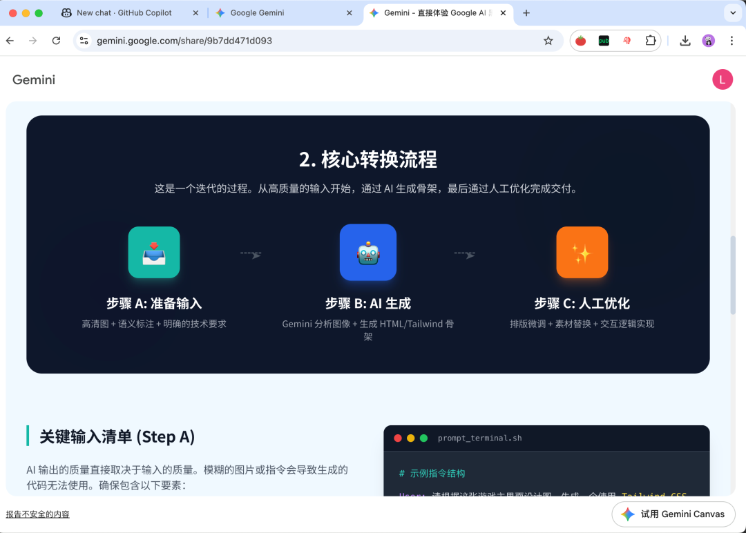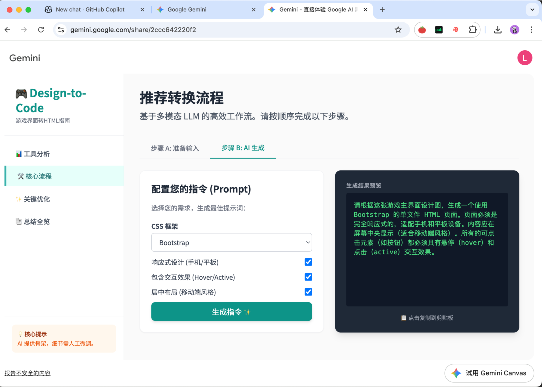 真正的"神来之笔"在于 :在"核心流程"模块,它内置了一个可交互的Prompt生成工具 。你可以通过下拉菜单选择不同场景、目标,实时生成定制化的Prompt指令。这已超越了"信息展示",升级为可亲手操作、在实践中学习的"交互式实战工具"。