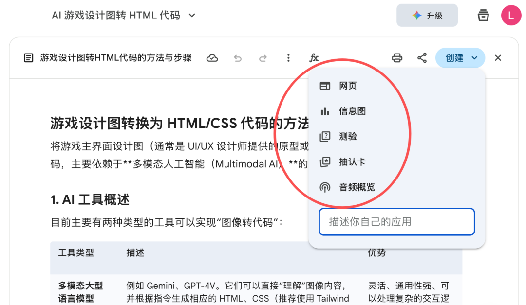 一个不起眼的 "创建"按钮 ,点开后,一个微型"应用工厂"就此展开。它提供了【网页】、【信息图】、【测验】、【抽认卡】等多种形式。选择任意一项,Gemini都将以这篇文章为蓝本,现场为你编译、生成一个功能完整的SPA。