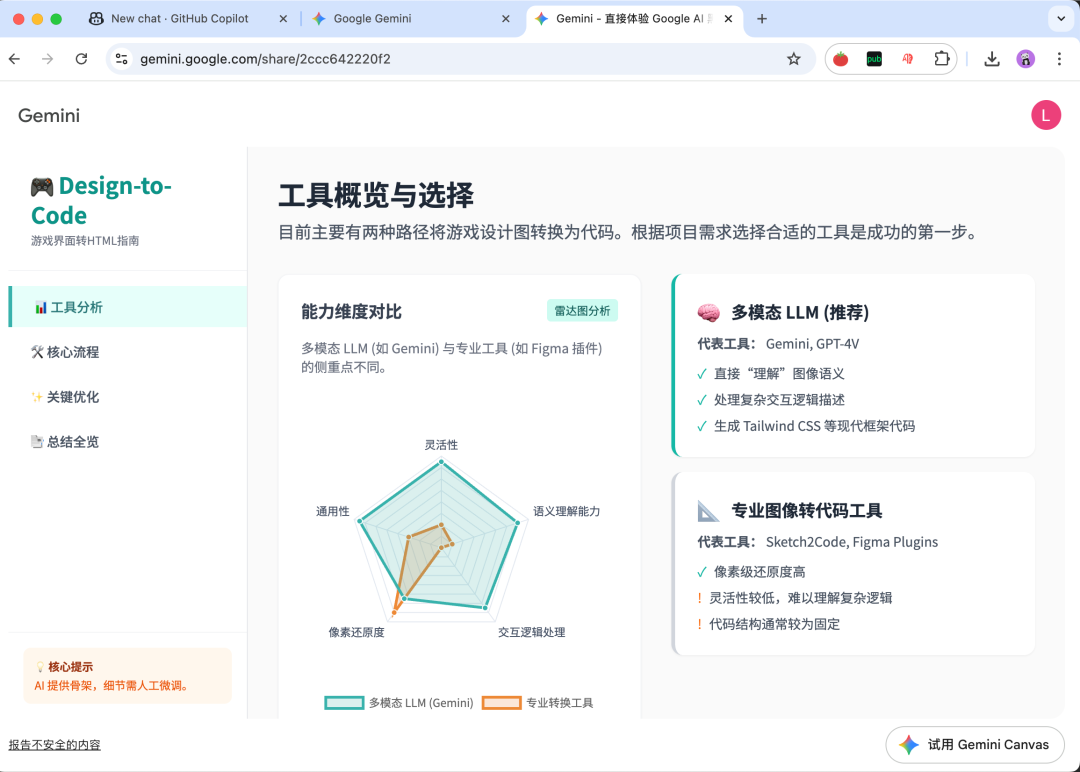 点击后,数秒之内,一个结构清晰的SPA诞生。它将文章内容提炼、重组,以可交互的演示程序形式呈现。左侧导航栏设有多个菜单,核心流程、技术要点一目了然。