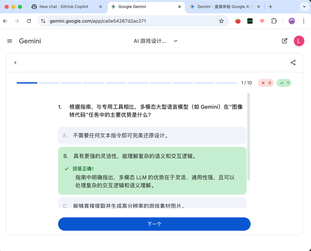 Gemini根据文章内容,自动生成了10道测验题,支持交互式作答与即时反馈。我马上试用了一下,这10道题覆盖了文章的主要内容点,点击提交的交互体验也很不错。