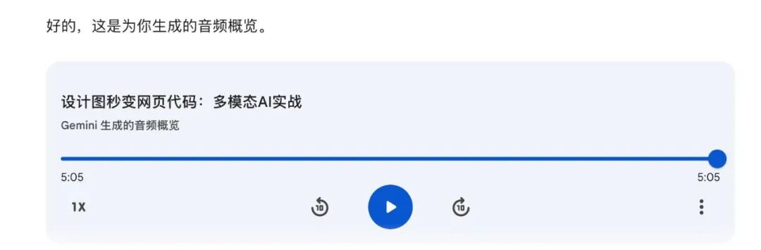 我看到还有一个"音频概览"功能,它可以将文本转化为可听的简报,解放双眼。我试了一下,他给我生成了一个5分钟的访谈播客。音频里面一男一女,纯正的普通话,一问一答,语气自然。哇,我只能用"666"来形容了。