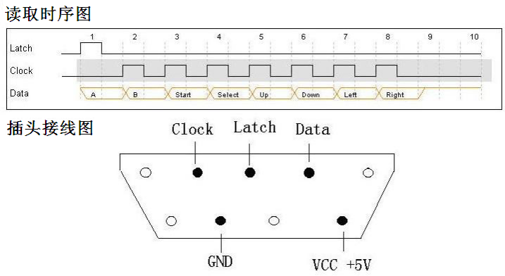 可采用 STM32 的 3 个普通 IO 连接 FC 手柄的 Clock、Data 和 Latch 信号,通过设置 IO 口状态,按照特定的时序读取手柄按键值。如先将 Latch 置 1 锁存当前状态,再置 0,然后在 Clock 的作用下,依次读取 A、B、SELECT、START、UP、DOWN、LEFT、RIGHT 这 8 个按键的键值,按下为 0,松开为 1。