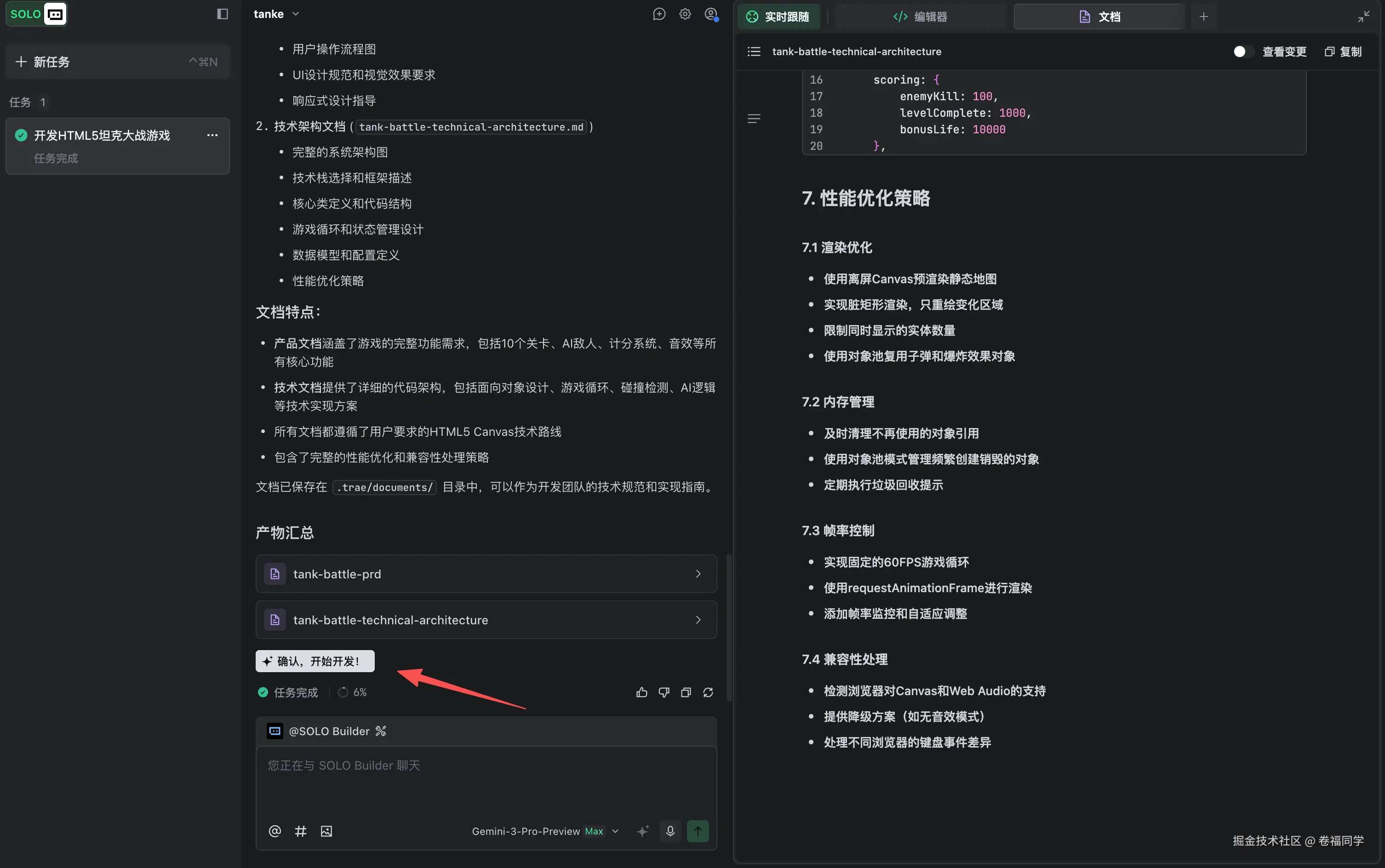 Trae SOLO会先生成需求文档和技术架构文档,我们确认没问题之后就可以开始了。有问题可以继续对话让Trae SOLO修改就行