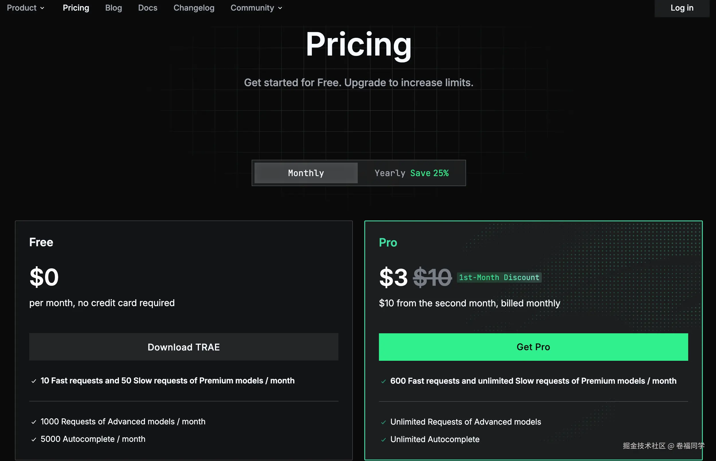 这一步小卷没注意到Trae Solo是Pro会员才有的功能,看了下价钱,首月只需要3美刀,折合下来是21块钱,还算可以,于是开通一个月的会员尝尝鲜