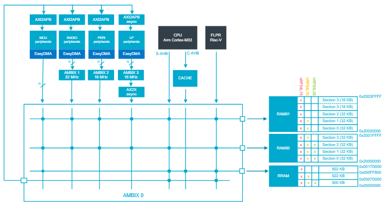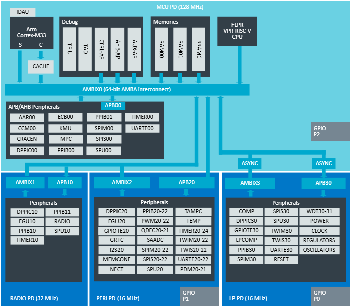 每个域都映射到一条 APB 总线,并且可以独立供电。来自每个域的 EasyDMA 流量聚合在本地 AMBIX 互连中,并且可以访问 MCU 域中的 RAM。