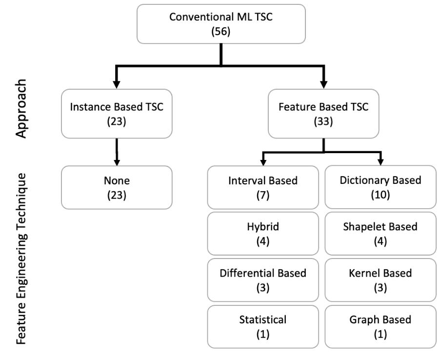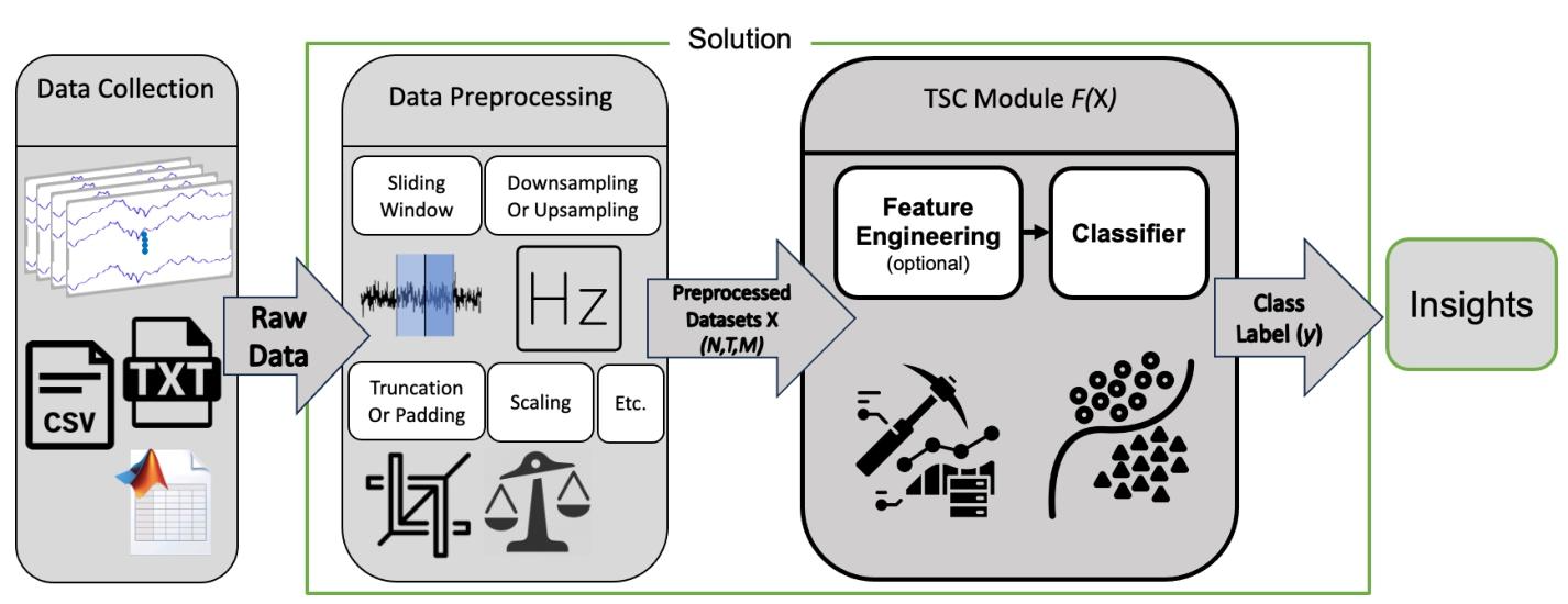 - TSC算法框架:包含数据采集、预处理(截断/填充、标准化等)、TSC模块(可选特征工程+分类器),最终输出类别标签与决策洞察。